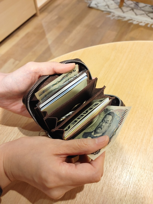 以前は、NUMEのMINI ZIPを愛用していたので、使いはじめはハリ感があって硬いかなと思ったそうですが、お札が入れやすいのと逆にフォルムが崩れないところが今では使いやすい!とのことです。