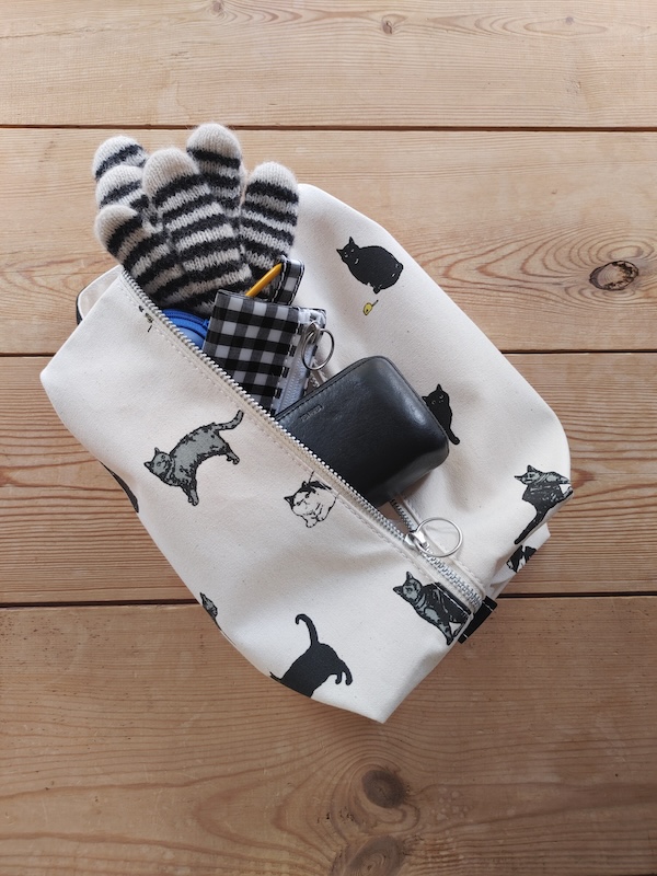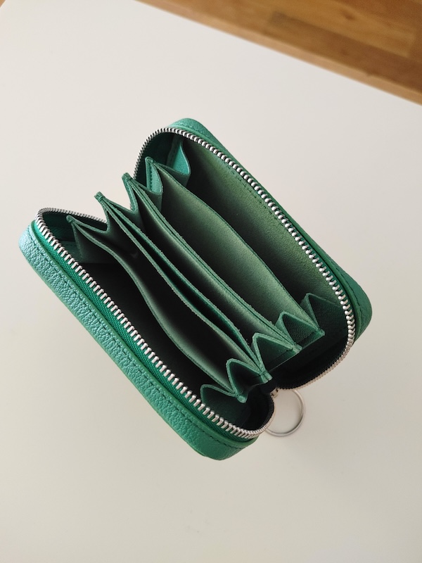 わたしは、最近まで名刺、交通系IC、免許証や保険証、ステッカーなどを用途に合わせて入れ替えて使っていました。マチなしですが、仕切りがありお財布として使っているお客様やスタッフも多いです!!