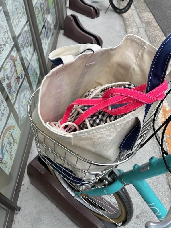 今日は自転車にて出勤。前カゴにすっぽりと収まります👍