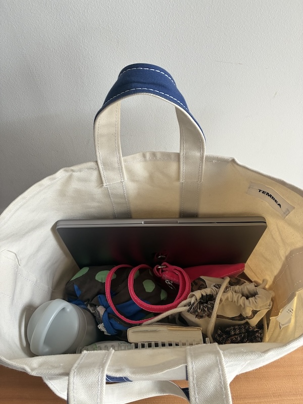 カバンの中には、お弁当や水筒、PCも入って「あれ忘れた!」が無いよう、とりあえず何でもかんでも放り込んで出かけるタイプです笑
