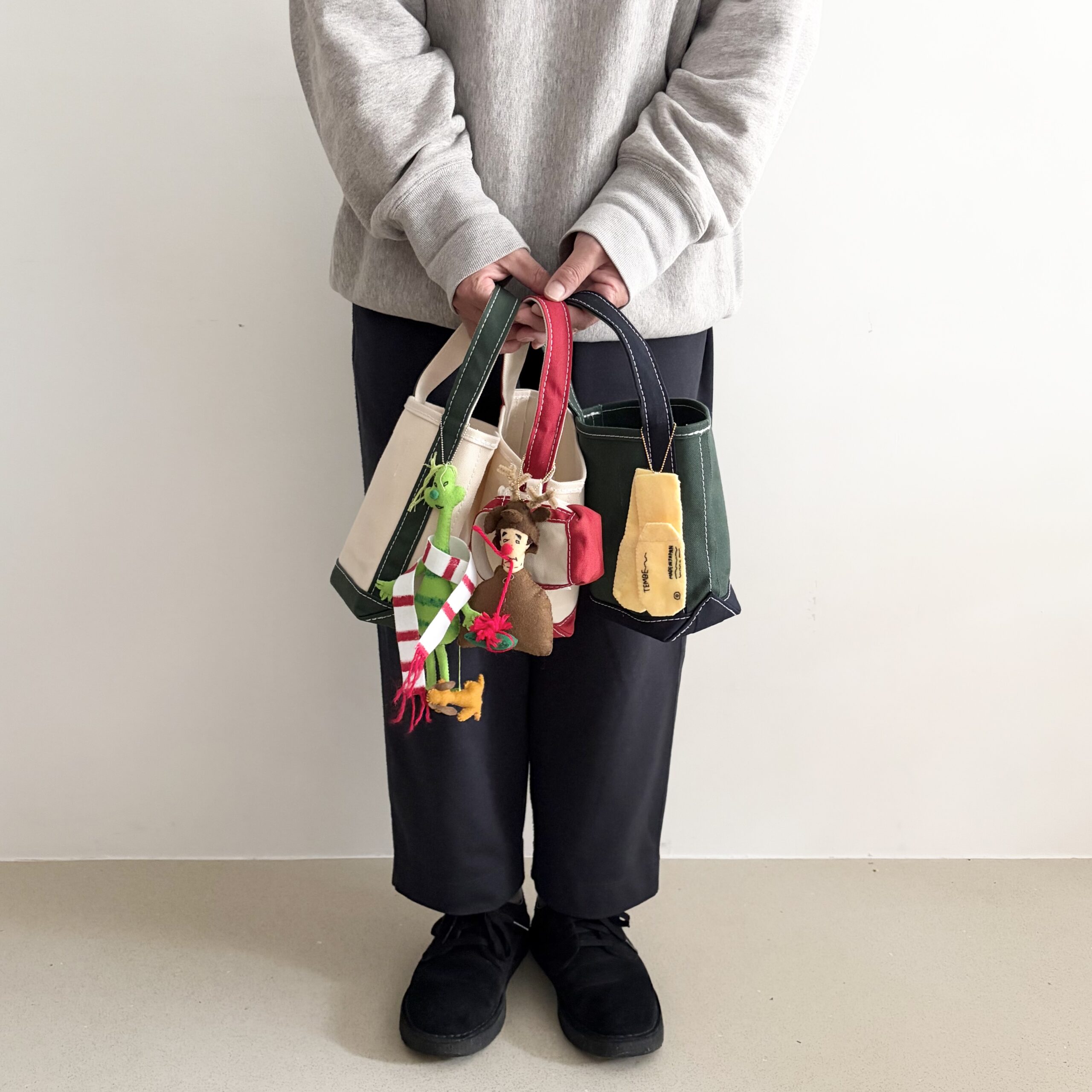最後はTEMBEAのアイテム。BAGからCAPにGUNSOKUまでキーホルダーサイズにゆる〜く小ちゃくなっています。(ひとつだけ、実物大があります。店頭で探してみてください!)