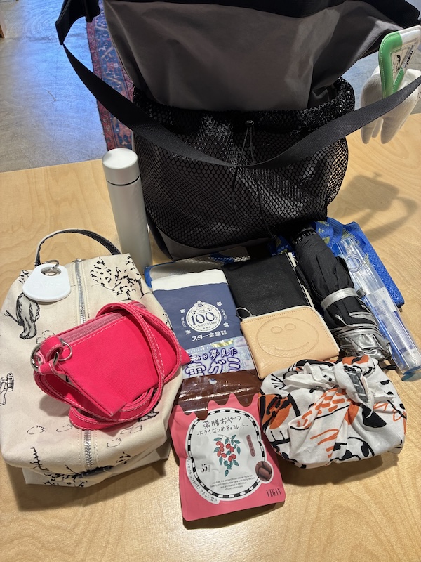 歯磨きセット、折り畳み傘、エコバック、お弁当箱、財布、カードケース、手帳、文庫本、おやつ1、おやつ2、水筒、GARMENT BAG SMALL(細々した物:カイロ、目薬、リップetc)、FLAT POUCH(複数の鍵)…これだけ入れても、帰りに明日のパンを買っても入るくらい余裕がありました🥐