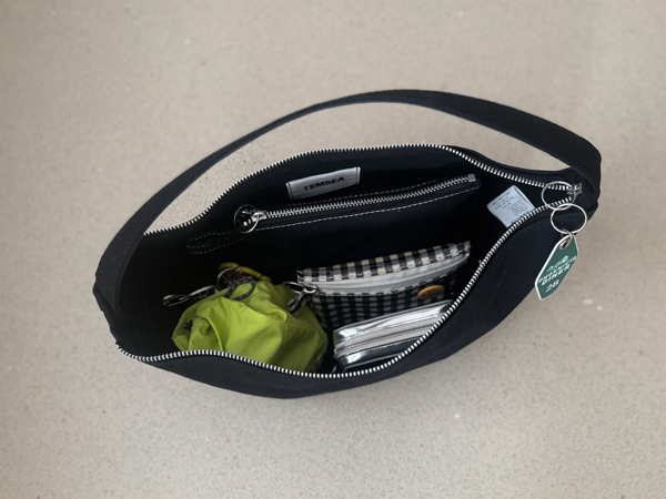中身はこんな感じに収まりました。マチが広いので見た目以上に荷物が入ります。袋口が広く開くので何が入っているかが一目瞭然!出し入れもしやすく、使っていてとても楽です。私は財布、ポーチ、スマホに加えて、ペットボトルや折り畳み傘などを入れる日も。通勤や、休みの日のお出かけでも活躍中です。