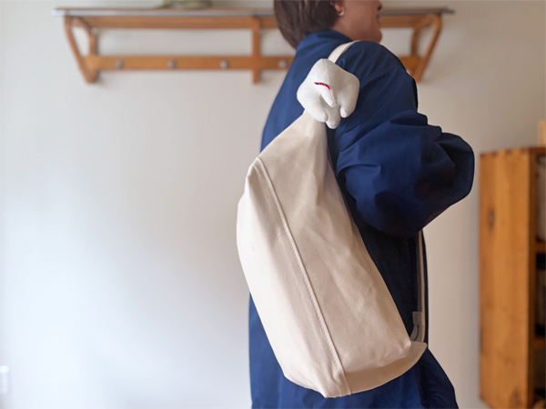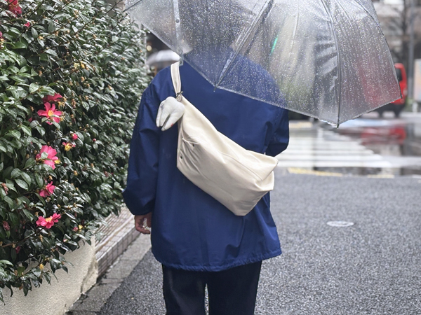 斜めがけができて、収納力もしっかりめ。背負うと手が空くし、袋口はファスナーで閉まるので雨の日にも良さそうです。