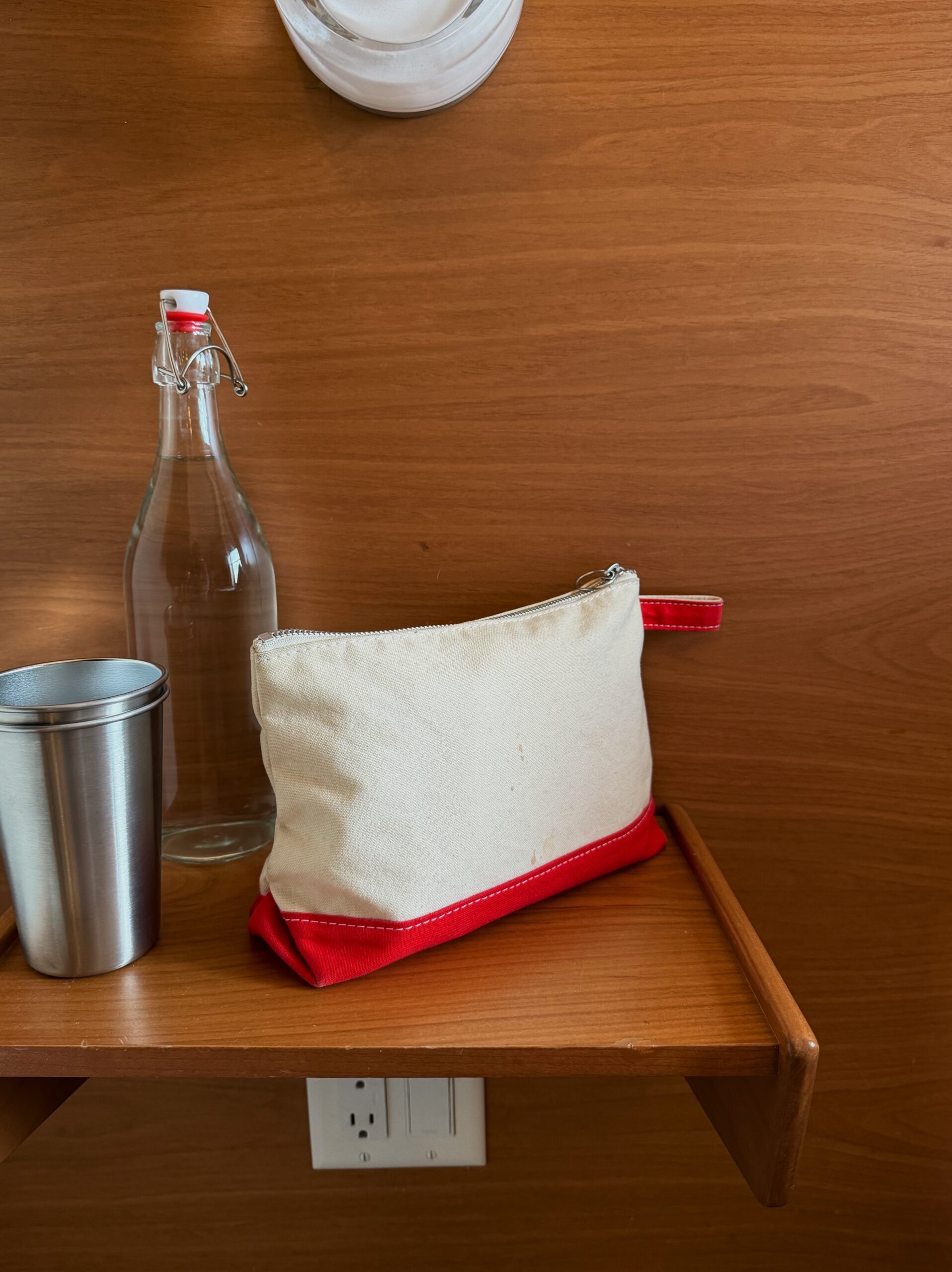 旅先では、慣れない環境にソワソワするので、洗面用具はできるだけいつも使っているものを小分けのボトルに入れて持っていくようにしています。小分けとは言え、けっこうな量の洗面用具一式をまとめておくのに、26SSシーズンで復活したTOILETRY BAG LARGEも持っていきました。(このカラーは今シーズンの展開はありません🙏)