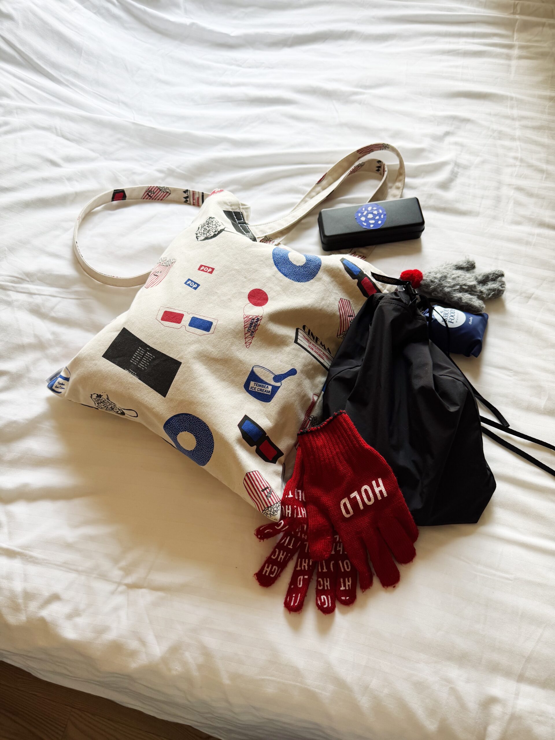 ちょうど日本でも公開になったWickedのミュージカルを観劇する予定だったので、シネマ柄を迷わず持っていくことにしました。とにかく着込んで、ぶくぶくに膨れていたのでショルダーが長めで助かりました。3HANDLE TOTEはマチが無いけれど、けっこう荷物が入ります。外にいる時は、ほぼ空っぽで、建物内に入ると暖房がめちゃくちゃ効いていて、暑かったのでアウターやマフラーを脱いで中に入れて使っていました。