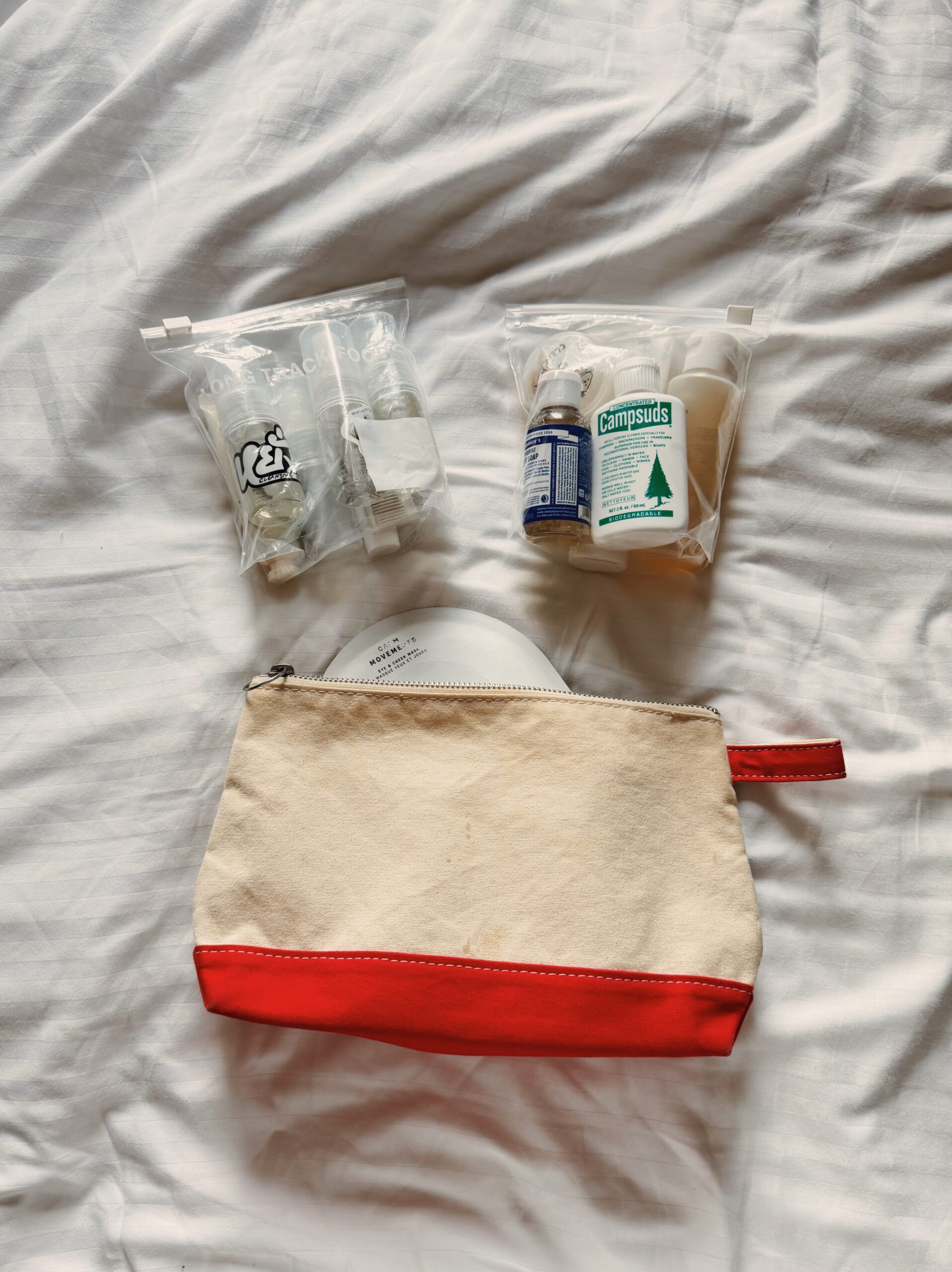AOKIのブログでも先日紹介があったかと思いますが、マチ付きのポーチです。LARGEサイズには、5泊分の洗顔、ボディソープ、シャンプー、コンディショナー、ヘアケア類、パックなどが一つに収まりました。防水機能が無いので、漏れると地獄。。ジップロックで小分けにして対策しました。こうしておくと、旅行から帰った後もそのまま棚に戻せるので、帰国後の後片付けが楽ちんです。あと、サウナや銭湯に行ったりするときにも、便利でした!