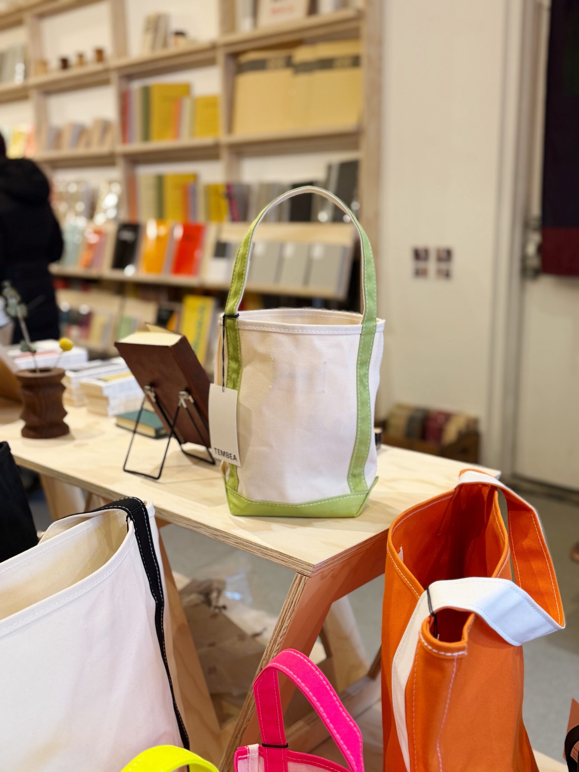 以前から、日本やロサンゼルスの店舗でお取り扱いしていただいていますが、2025年12月にニューヨークにできた新しい店舗でもTEMBEAの商品を見ていただけます。日本の文房具や雑貨・奥のスペースにはアパレル商品も。壁面の棚には整然と商品が並び、心地の良いレイアウトが目を惹きます。カラフルでポップな店内には、ポップな配色のBAGUETTE TOTEがとても似合っていました!