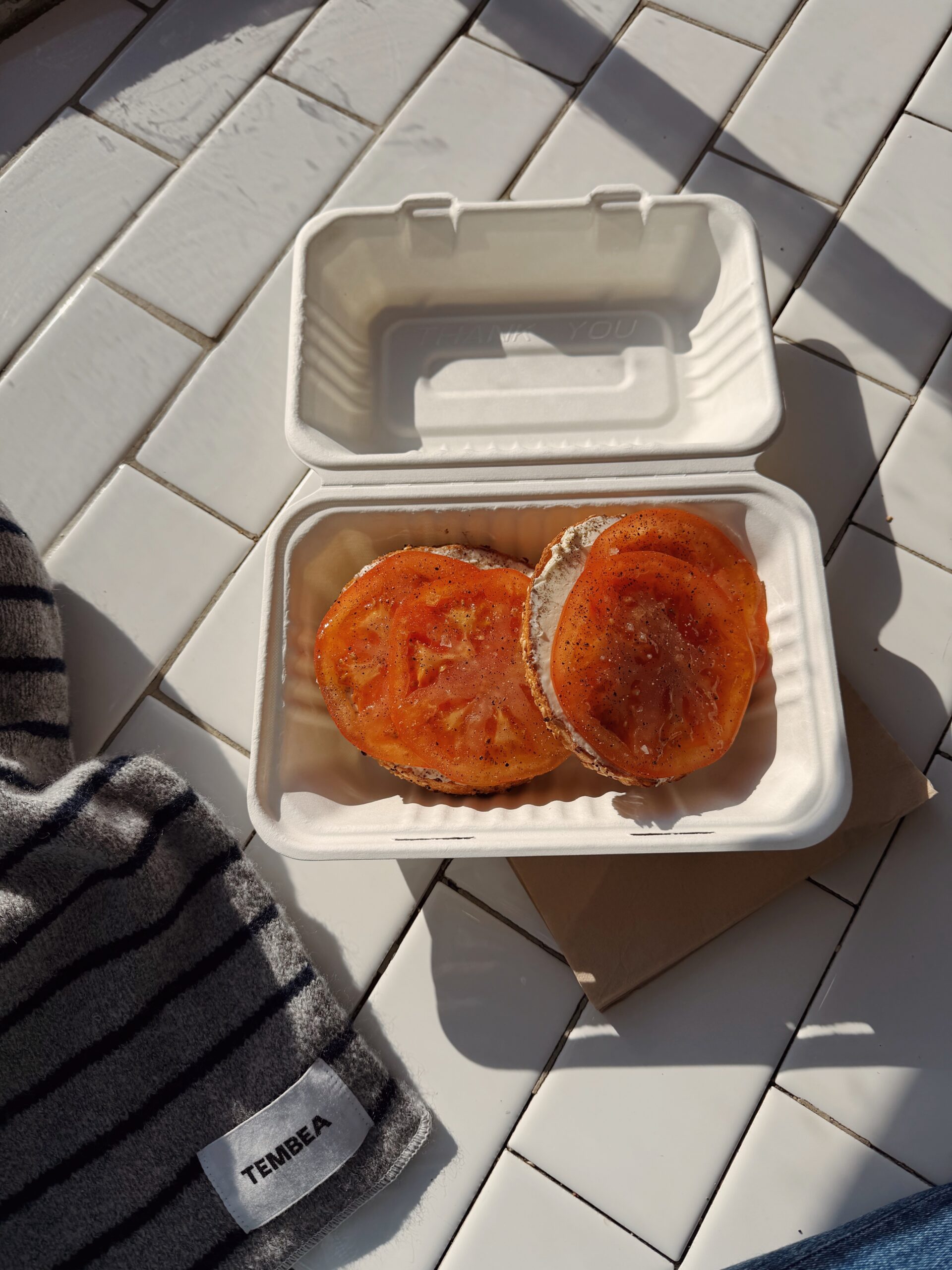 クリームチーズをたっぷり塗った上に厚切りのトマトを乗せたシンプルなベーグルがとってもおいしかった!サイズがけっこう大きいので、シェアするくらいがちょうど良いかもしれません。暖かかったら、公園で食べてもよかったな。