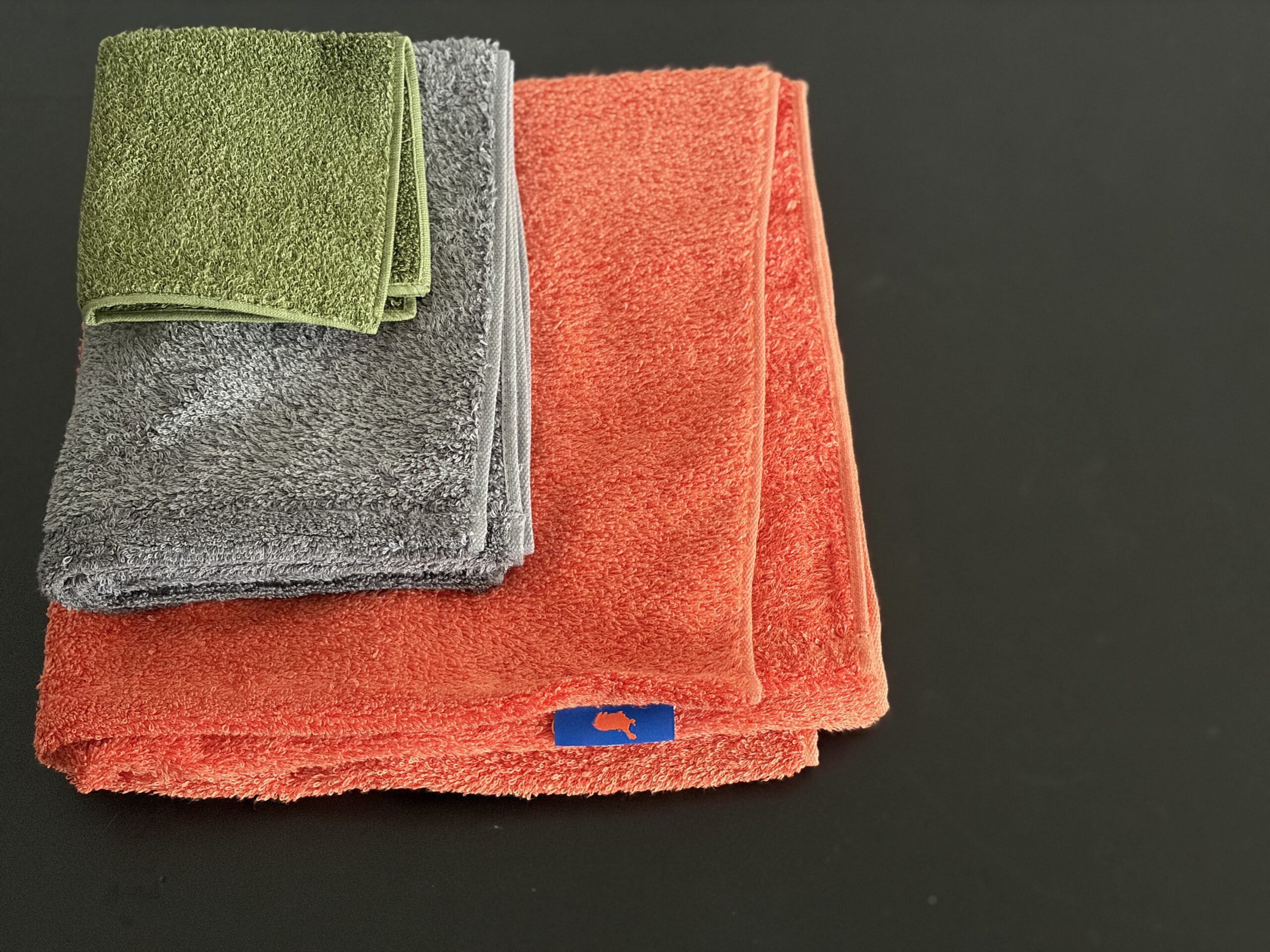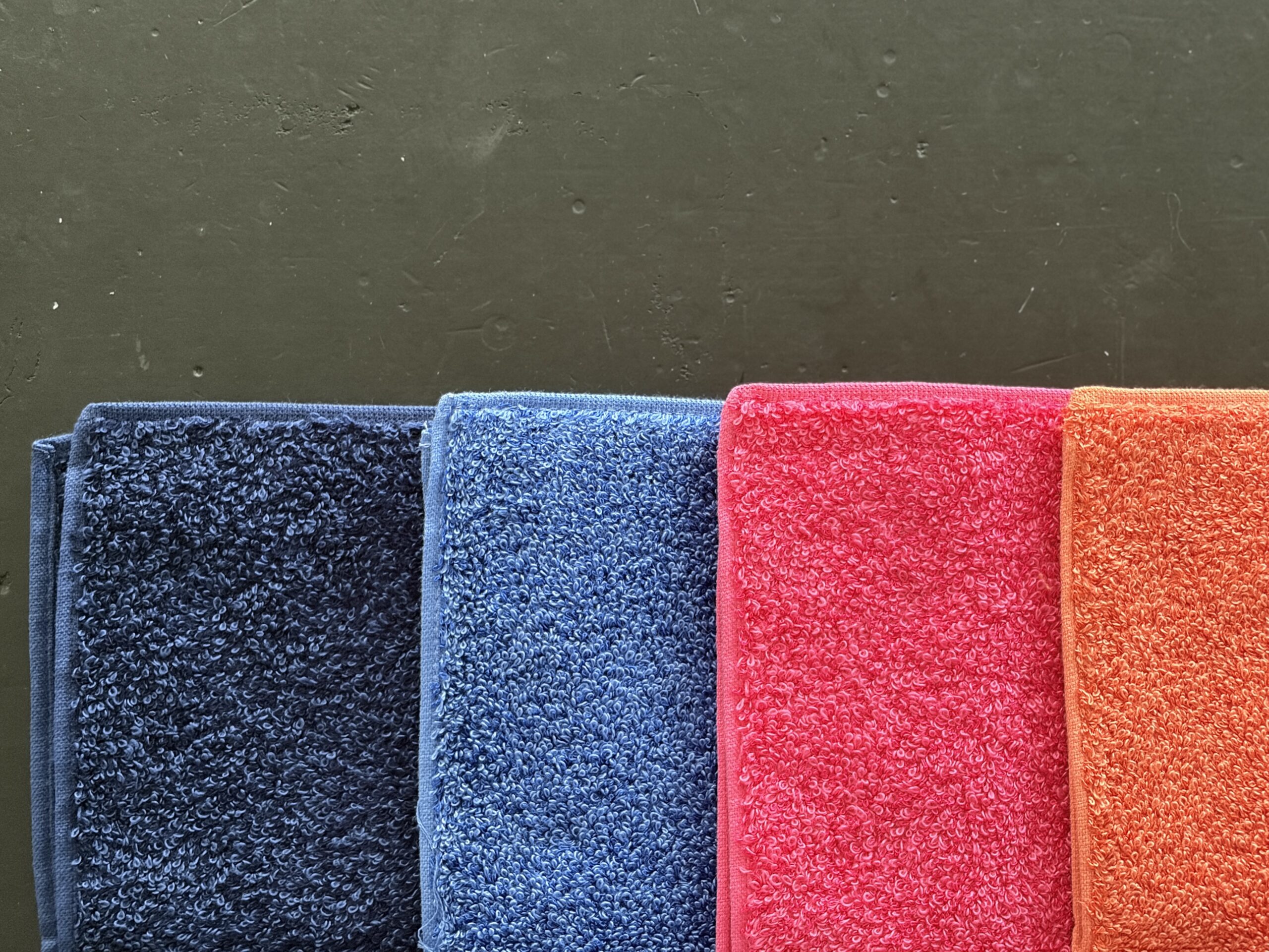 定番で使っているパイル生地はオーガニックコットンと再生竹繊維を織り交ぜて作られています。この異素材を織り交ぜることで、鮮やかで印象深いカラーリングに加え吸水性や速乾性のあるタオルに仕上がります。