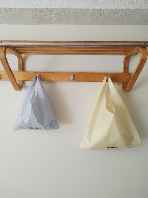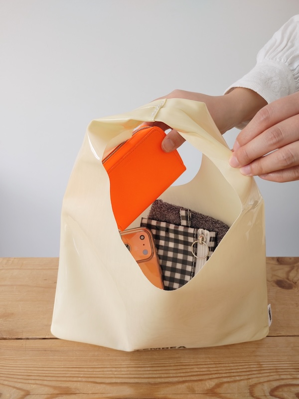 日本の伝統的なあずま袋をイメージしたAZUMA BAGです。よく風呂敷などで作られているものを目にする機会も多いかもしれません。こちらは、ブロード生地にPVCコーティングされているので、水に濡れてもサッと拭ける防水性があります。耐久性もあるので、ウォーターボトルなど、少し重さがある物も入れられます。