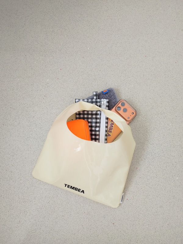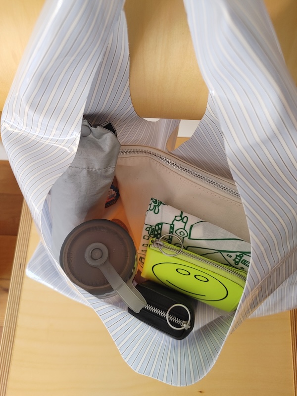 ウォーターボトル、折りたたみ傘、ポーチ、お財布、マルチケース、ハンカチがしっかり入ります。